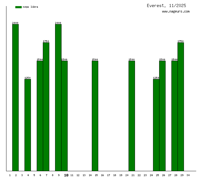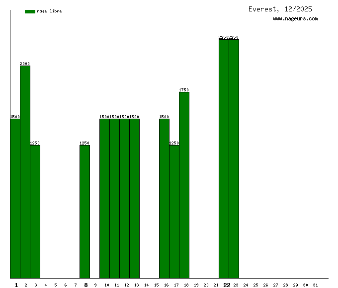 Ces 6 derniers mois, Everest a nagé dans les piscines suivantes : Piscine municipale de Thiers (73.2 km), Piscine municipale d'Ambert (26.8 km), Stade Nautique de Bellerive-sur-Allier (7.4 km), Piscine municipale de Vic-le-Comte (6.2 km), Piscine d'Étaples (5.8 km), Stade nautique Pierre-de-Coubertin (Clermont-Ferrand) (3.5 km), Piscine Georges Hermant (Paris) (2.4 km), Piscine Paul Valeyre (Paris) (2 km), Piscine du Ministère de la Défense (Paris) (2 km).