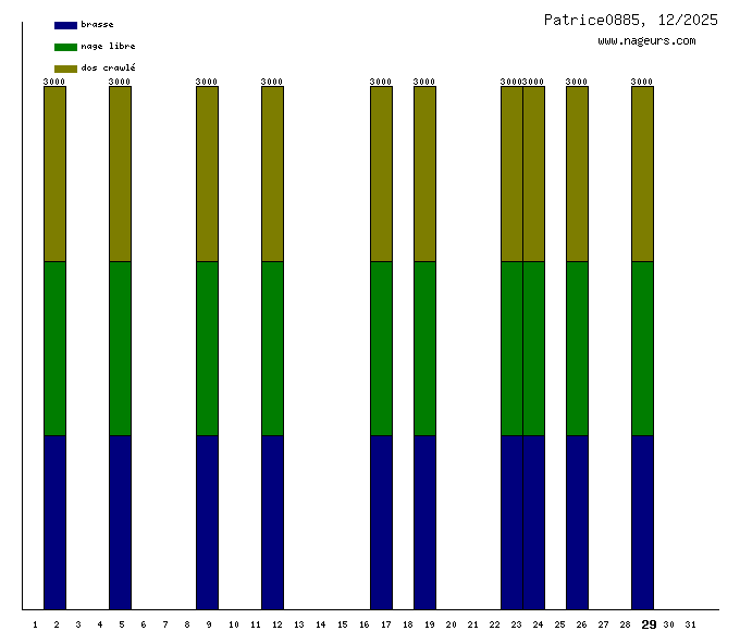 Ces 6 derniers mois, Patrice0885 a nagé dans les piscines suivantes : Piscine Suzanne Berlioux (Paris) (75 km), Piscine Roger Le Gall (Paris) (29.7 km), Piscine Georges Vallerey (Paris) (21 km), Piscine Jean Boiteux, ex Reuilly (Paris) (3 km).