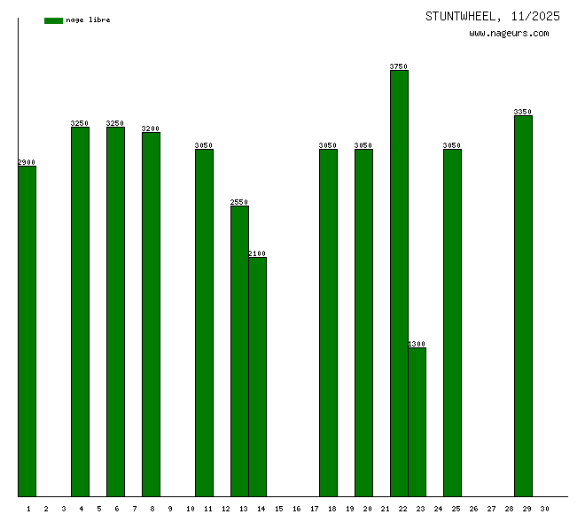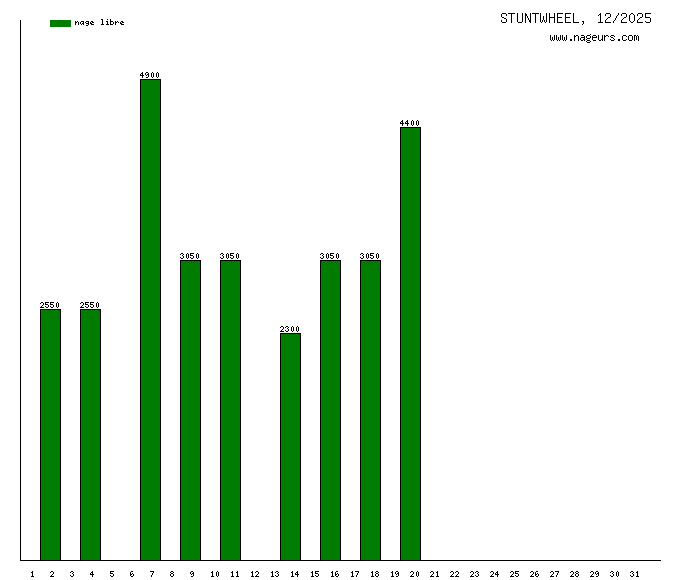 Ces 6 derniers mois, STUNTWHEEL a nagé dans les piscines suivantes : Piscine Suzanne Berlioux (Paris) (145.2 km), Piscine l'Hippocampe (Villiers sur Marne) (55.4 km), Centre Aquatique Intercommunal Paris - Vallée de la Marne (Champs-sur-Marne) (26 km).