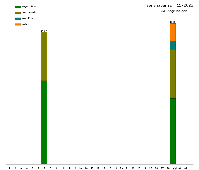 Ces 6 derniers mois, Serenaparis a nagé dans les piscines suivantes : Piscine Cour des Lions (Paris) (23.5 km), Piscine de Pontoise (Paris) (1.6 km).