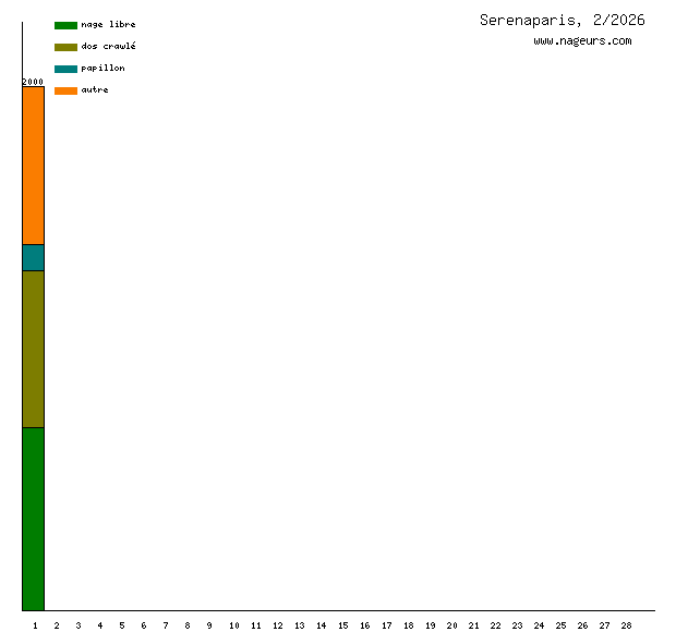 Ces 6 derniers mois, Serenaparis a nagé dans les piscines suivantes : Piscine Cour des Lions (Paris) (19.9 km), Piscine Judaïque (Bordeaux) (2 km).