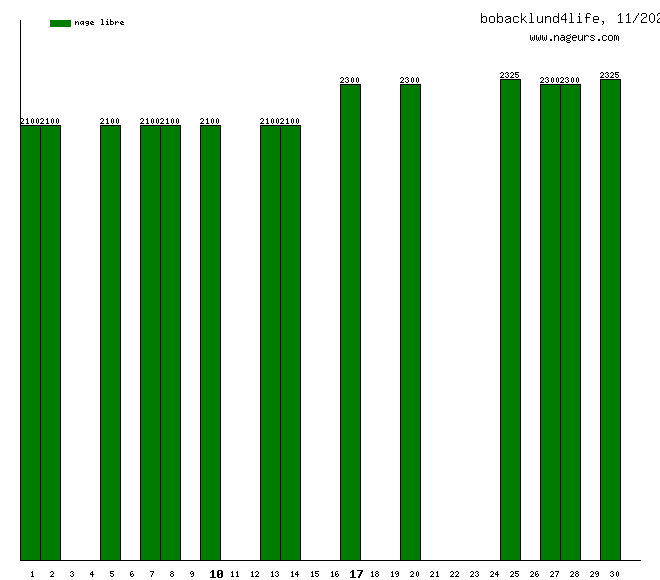 Ces 6 derniers mois, bobacklund4life a nagé dans les piscines suivantes : Hollywood YMCA (Los Angeles, Etats Unis) (54.8 km), Ketchum-Downtown YMCA (Los Angeles, Etats Unis) (32 km), Piscine René et André Mourlon (Paris) (29.9 km), Piscine Paul Valeyre (Paris) (16.3 km), Piscine Bertrand Dauvin (Paris) (14.4 km), Embarcadero YMCA (San Francisco, Etats Unis) (7.5 km), Piscine Aspirant Dunand (Paris) (2.3 km), Piscine Emile Anthoine (Paris) (2.3 km), Piscine Marie-Marvingt (ex Saint Merri) (Paris) (2.1 km), London Aquatics Center (London, Royaume Uni) (1.2 km).