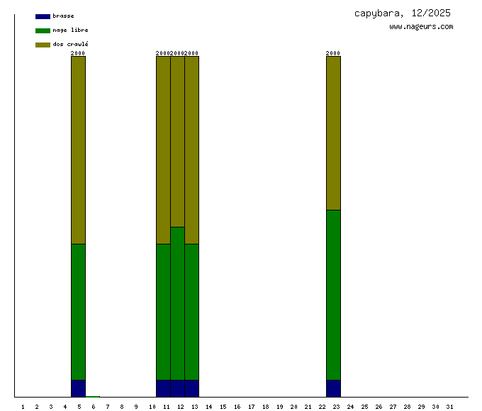 Ces 6 derniers mois, capybara a nagé dans les piscines suivantes : Piscine Plein Sud (Lille) (130.1 km), Piscine Suzanne Berlioux (Paris) (2 km), Piscine Olympique Marx Dormoy (Lille Bois Blancs) (1.4 km).