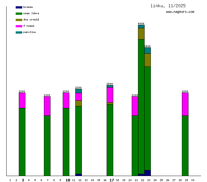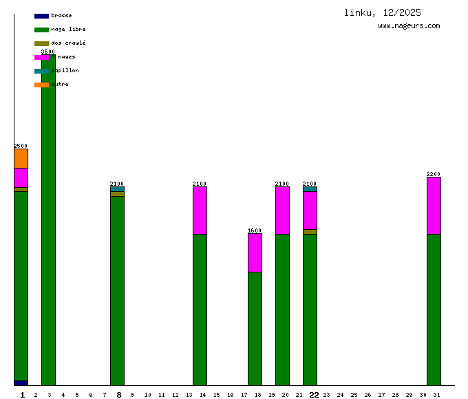 Ces 6 derniers mois, linku a nagé dans les piscines suivantes : Piscine Thérèse et Jeanne Brulé (ex Elisabeth) (Paris) (26.6 km), Piscine de Bagneux (22.4 km), Centre Aquatique Olympique (Saint-Denis) (22.2 km), Piscine de l'INSEP (Paris) (16.1 km), Piscine Butte aux Cailles (Paris) (12 km), Aquapol (Montrouge) (5.8 km), Piscine Alfred Nakache (Paris) (2.5 km), Centre aqualudique La Loue (Saint Victor) (2.2 km), Piscine municipale Jean Andrieu (Choisy-le-Roi) (2.2 km), LOU Piscine (Lyon) (2.1 km), Centre Aquatique La Vague (Palaiseau) (2.1 km), Centre Nautique Etienne Gagnaire (Villeurbanne) (2 km).