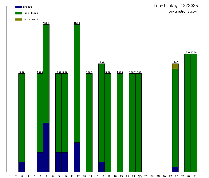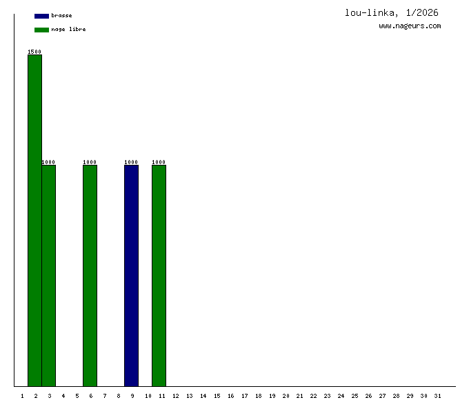Ces 6 derniers mois, lou-linka a nagé dans les piscines suivantes : Piscine Blomet (Paris) (21.6 km), Piscine de Nogent-sur-Marne (18.2 km), Stade nautique Maurice Thorez (Montreuil) (9.8 km), Piscine Marie-Marvingt (ex Saint Merri) (Paris) (9.2 km), Piscine Saint Germain (Paris) (6.1 km), Piscine de Pontoise (Paris) (4.5 km), Piscine Butte aux Cailles (Paris) (3.2 km), Piscine Cour des Lions (Paris) (3.2 km), Piscine Rouvet (Paris) (2.4 km), Piscine Jean Boiteux, ex Reuilly (Paris) (2 km), Piscine Alfred Nakache (Paris) (1.8 km), Piscine Robert Belvaux (Le Perreux Sur Marne) (1.2 km), Piscine Joséphine-Baker (Paris) (1.1 km), Piscine Bertrand Dauvin (Paris) (1.1 km), Piscine Thérèse et Jeanne Brulé (ex Elisabeth) (Paris) (1000m), Piscine municipale de Bagnolet (1000m), Piscine Solita Salgado (Paris) (1000m), Piscine René et André Mourlon (Paris) (1000m), Piscine Keller (Paris) (1000m), Piscine Léo Lagrange de Nantes (1000m), Piscine Emile Anthoine (Paris) (800m), Centre Aquanautique Camille Muffat (Rosny sous Bois) (400m).