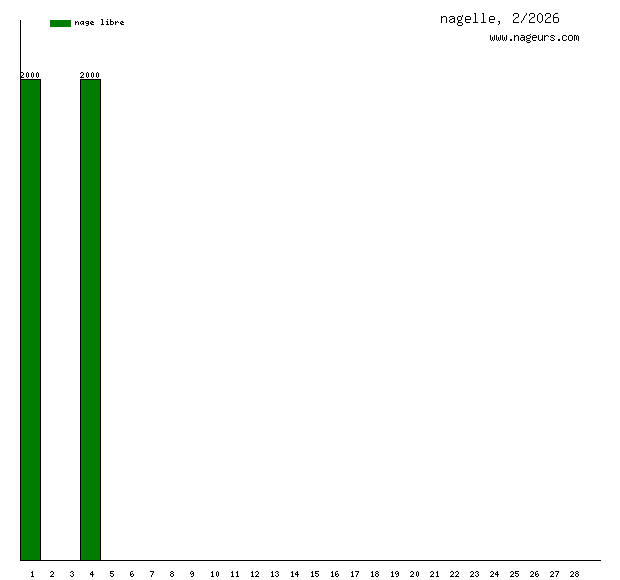 Ces 6 derniers mois, nagelle a nagé dans les piscines suivantes : Piscine Catherine Lagatu ex Parmentier (Paris) (92 km), Piscine Pailleron (Paris) (12 km), Piscine Alfred Nakache (Paris) (10.6 km), Piscine Georges Vallerey (Paris) (8.1 km), Piscine Georges Hermant (Paris) (2 km).