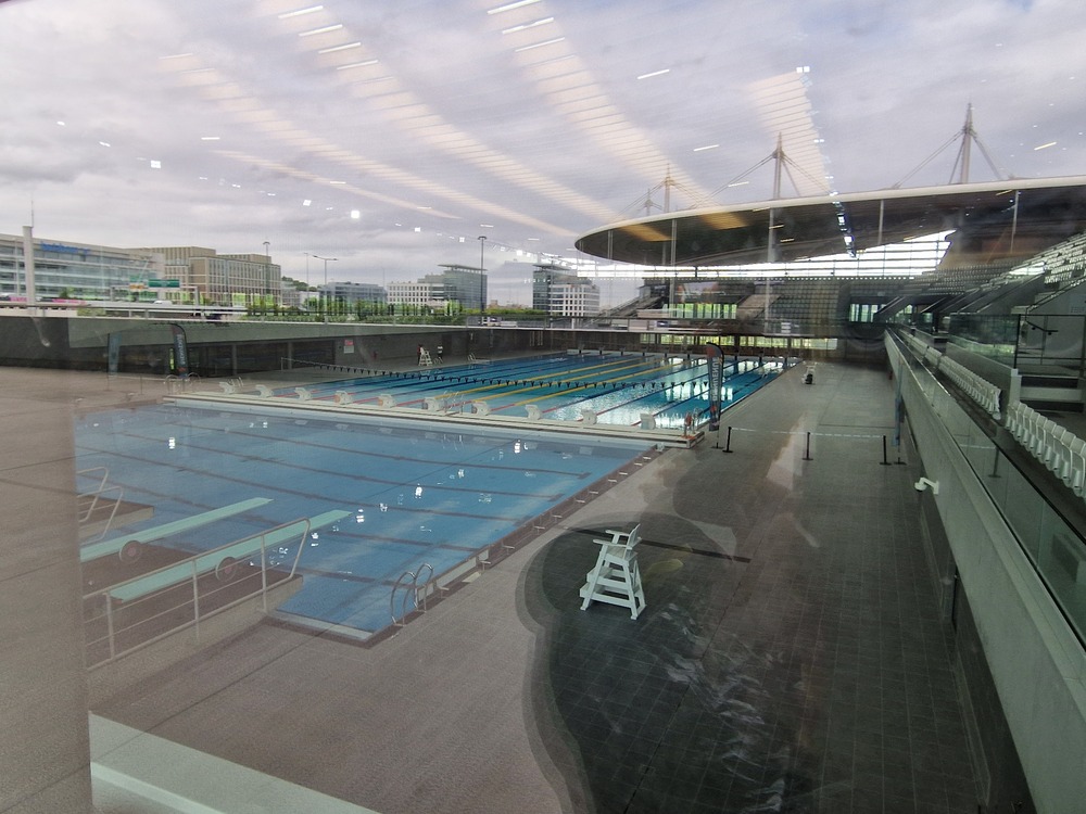 un bassin de 10 larges couloirs au milieu d'une immensité qui comprend aussi un plongeoir avec son immense bassin ; le 10 mètres semble rétrécir au milieu de cet espace ; par les baies vitrées on aperçoit la silhouette du stade de France .