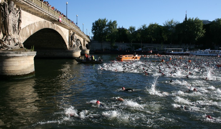 Vue des triathlètes sur les berges de Paris, devant le pont Alexandre 3.