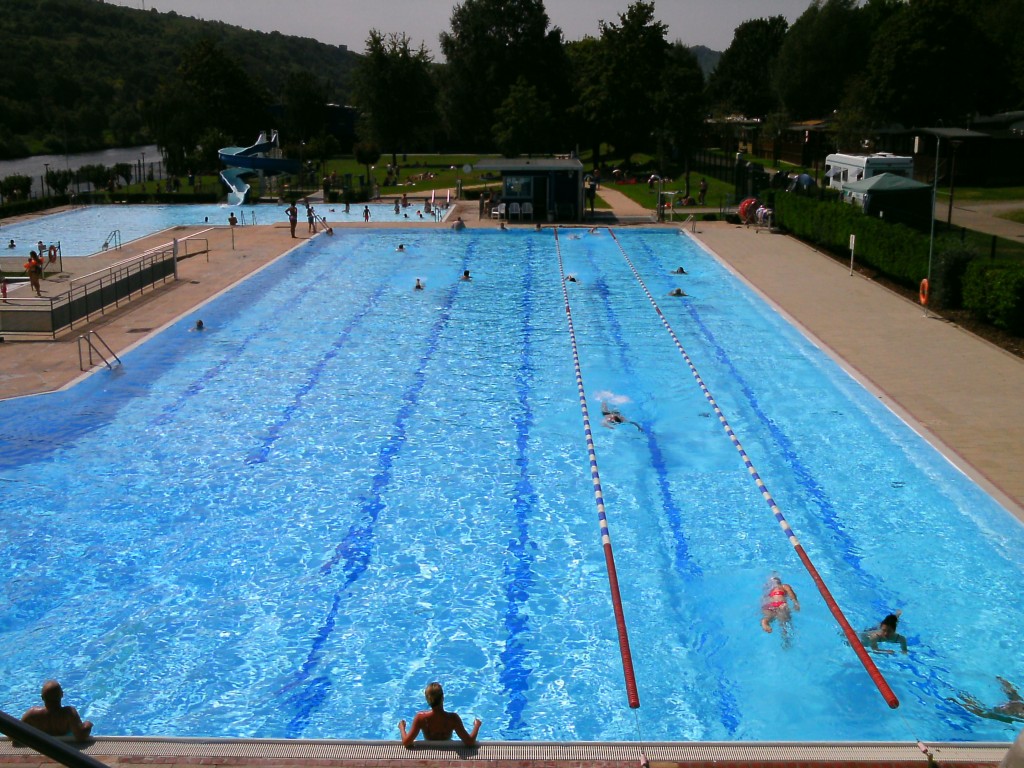 Toujours en longeant la Moselle, la piscine de Grevenmacher se situe un peu plus au Nord par rapport à celle Remich. On me l’a conseillée pour y nager ‘sportivement’, et c’est encore une révélation. Les bassins présentent la configuration typique des piscines en plein air des années soixante, avec un grand bassin de 50 m (6 lignes, dont deux balisées et réservées à une pratique un tantinet plus intense), un petit bassin d’initiation (avec tobbogan) et le poste de surveillance des maîtres nageurs qui donne sur les deux à la fois. En outre il y a tout ce qu’il faut: un plongeoir, un petit bassin ludique, des douches et des cabines impec, un grand pré garni de quelques arbres épars pour prendre son bain de soleil…