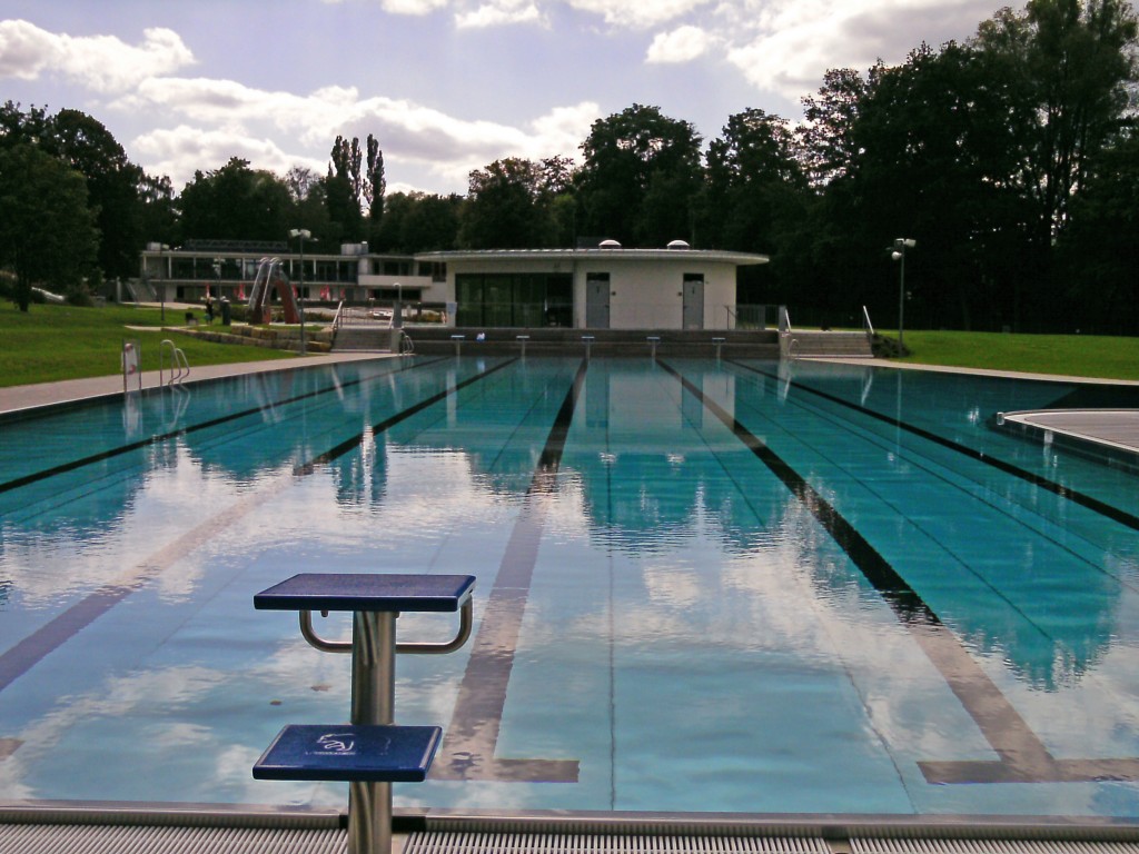 La ville possède deux piscines en plein air, le Nordbad (bain du Nord) et le Südbad (vous aurez deviné). La première date des années trente et n’est pas tellement spectaculaire, j’ai fait des photos de la seconde, qui est une installation des années soixante, inscrite sur la liste du patrimoine historique de Trèves (les Allemands sont drôlement scrupuleux pour la conservation du patrimoine du vingtième siècle). Elle est un peu éloignée de la ville et pas forcément facile à trouver. En plus, le jour où j’y étais, il faisait beau, mais avec un froid de canard (l’eau était à peine à 20°). J’ai donc pu faire les photos et nager en toute tranquillité.