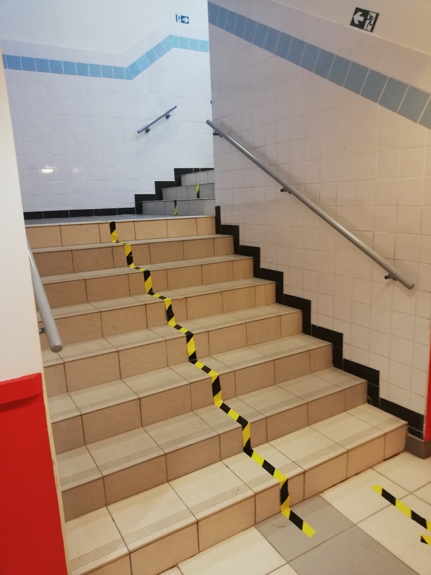 Les différents marquages au sol, permettent de rappeler à chacun à garder ses distances. Certaines piscines sont allé plus loin en installant des barrières pour séparer physiquement les sens de circulation.