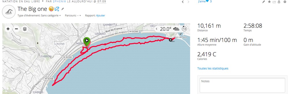• Sam 01 oct 2016 de 09h09 à 12h07, 2phenix a nagé 10161 mètres : Baie des Anges A/R sous un ciel gris, bonnes sensations générales même si sur le dernier Kil j'en avais plein les bras...L'eau était idéale, légèrement fraîche suffisamment pour déconnecter de tout... A refaire très vite