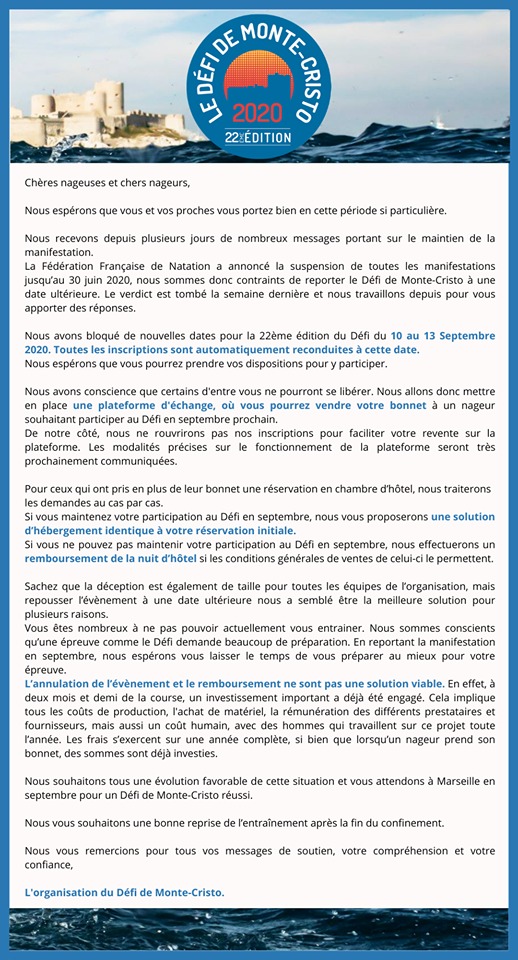 En raison de l'épidémie de COVID19, le défi de Monte Cristo aura lieu cette année en septembre
