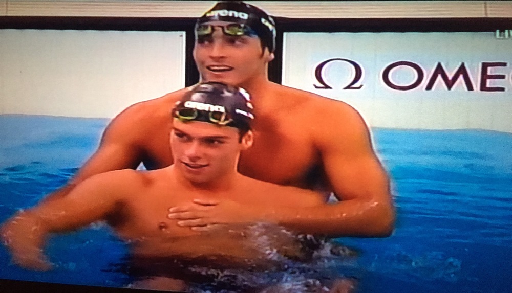 Sur la photo, le champion olympique est au premier plan, son compatriote, médaille de bronze, est derrière lui.