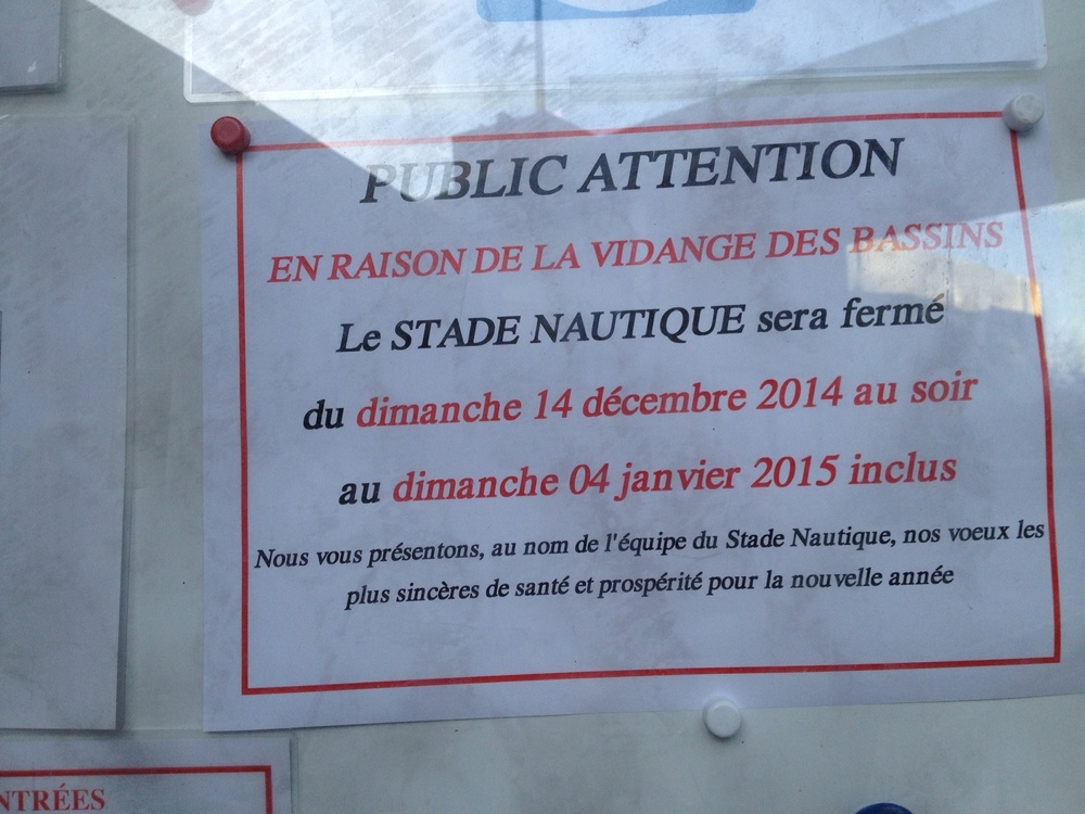 Nageurs.com > Forums > Le forum des piscines de Paris > Babette.nageuse: Fermeture du stade nautique de Châtillon du dimanche 14/12/2014 au dimanche 04/01/2015 inclus