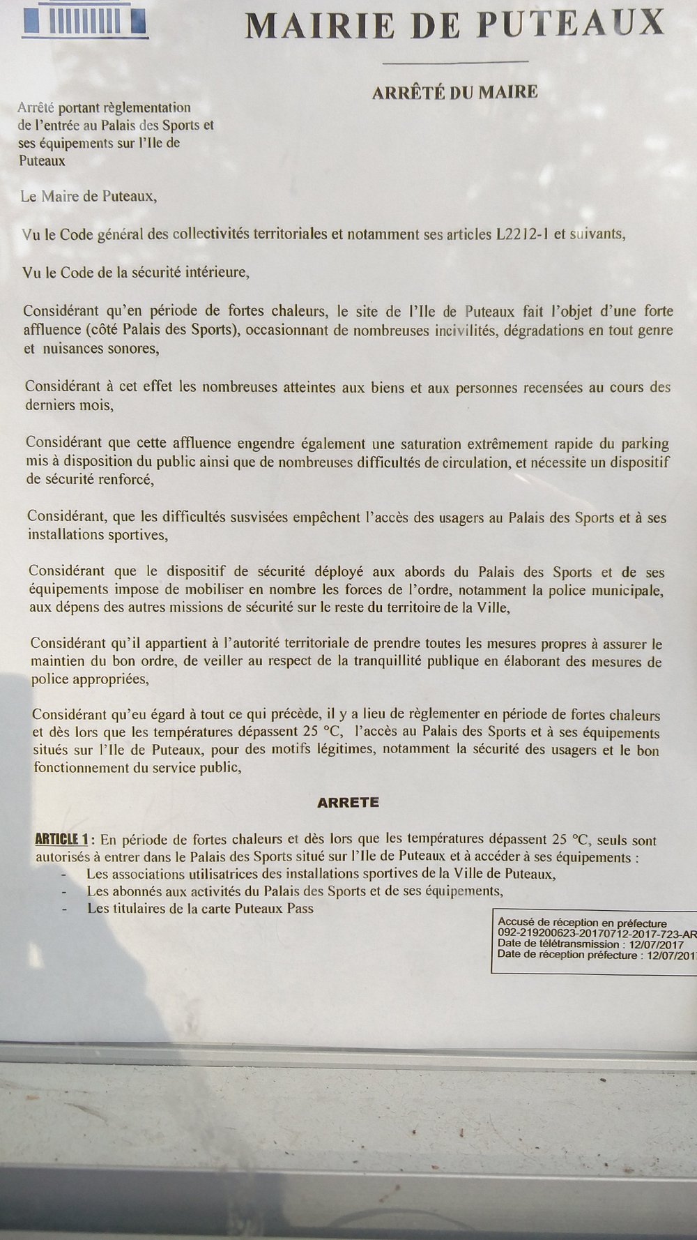 Suite a un arrêté du Maire de Puteaux en date du 12 Juillet 2017, l'accès à la piscine du Palais des Sports
