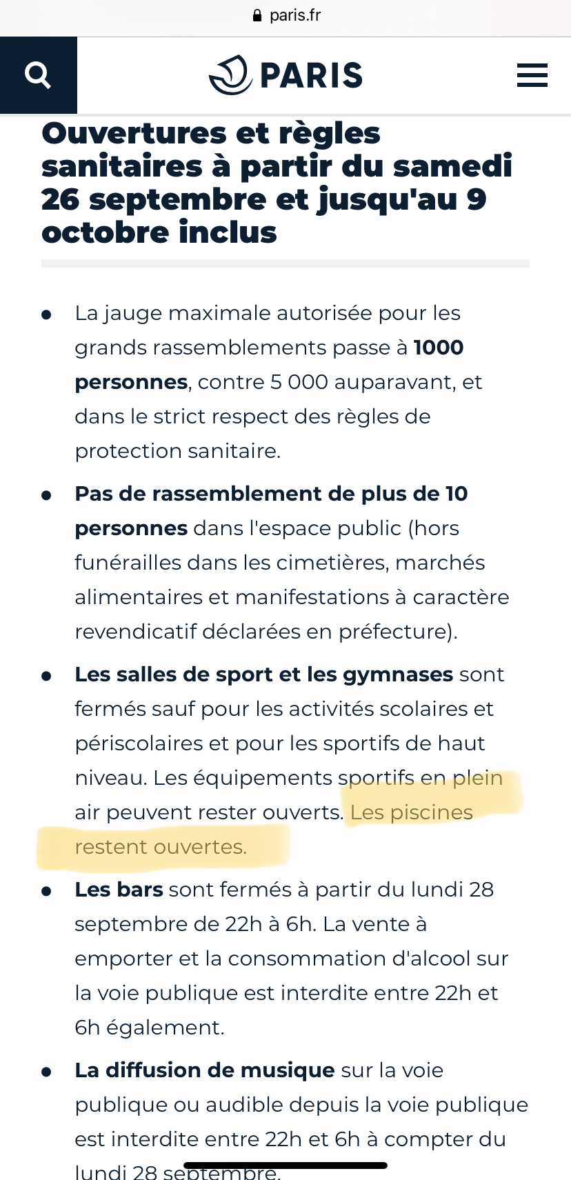 Je ne veux pas en rajouter une couche, mais apparemment à Paris même les piscines sont ouvertes, et en périphérie elles sont fermés, pour Lyon c’est totalement l’inverse, fermés dans la métropole, ouvertes en périphérie, je comprends qu’il y a de quoi s’y perdre, c’est totalement incohérent d’une métropole à l’autre...