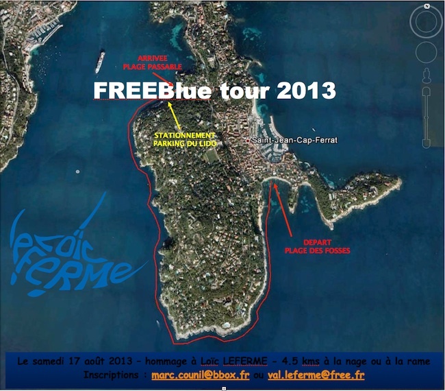 Bonjour à tous, si jamais vous êtes sur la cote d'azur je vous propose de venir partager un petit moment en l'honneur de Loïc Leferme, le free blue tour organisé par sa femme Val.. ambiance chaleureuse garantie! pas de compétition juste du plaisir dans un site particulièrement magnifique entre Nice et Villefranche: St Jean cap Ferrat...