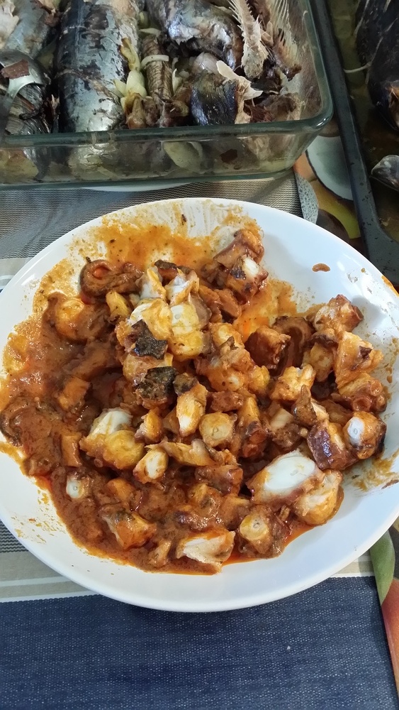 Poulpe à la sauce tomate et aux piments rouges, fait maison.