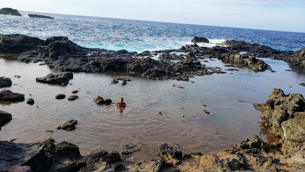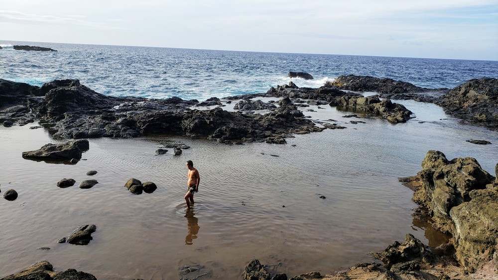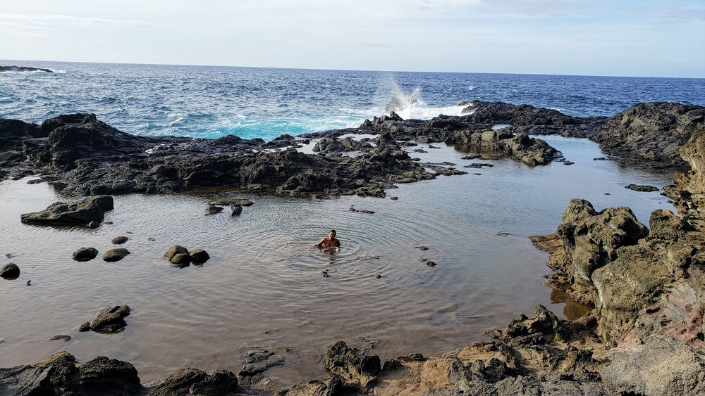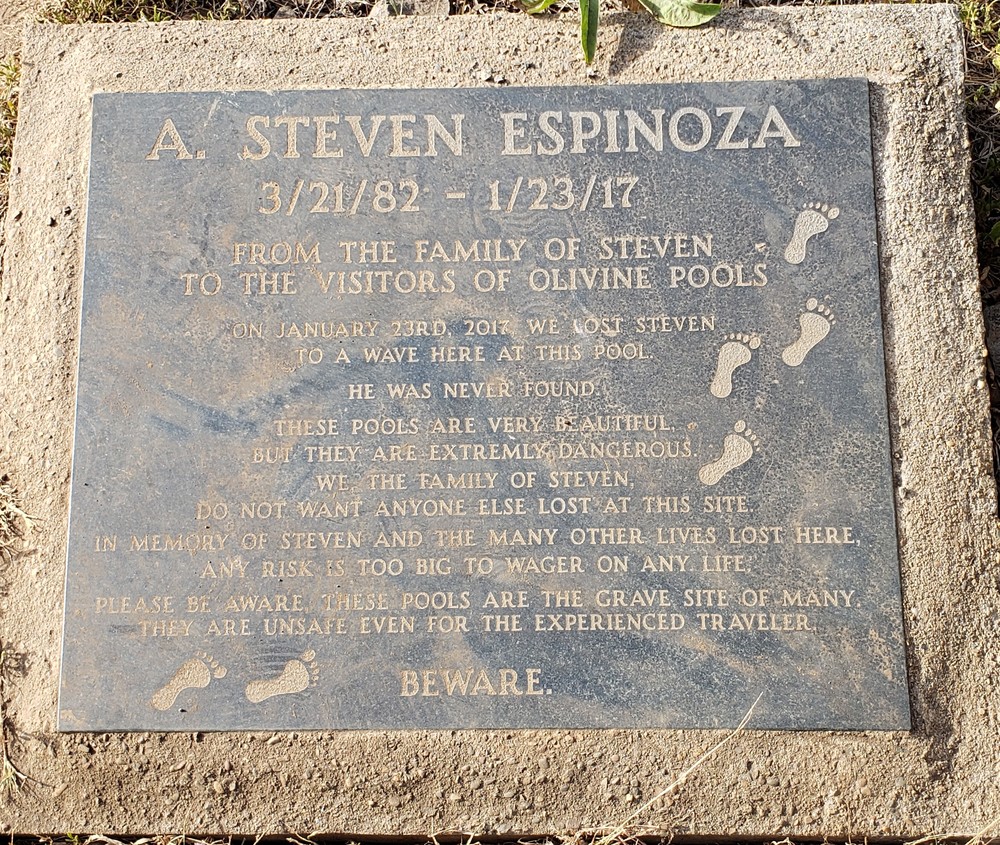 Aloha, Olivine Pools est une piscine naturelle située sur la côte Nord, à l'Ouest de Maui. Plusieurs personnes ont été emportées par les vagues. Les corps n'ont jamais été retrouvés (RIP). Donc, je n'osais pas m'aventurer trop loin, ne voulant pas devenir une statistique. Sinon, le bassin au fond, près des vagues déferlantes est nageable en temps calme, profondeur de 12 pieds. Mais aujourd'hui, les vagues sont puissantes et traîtres (freak waves).