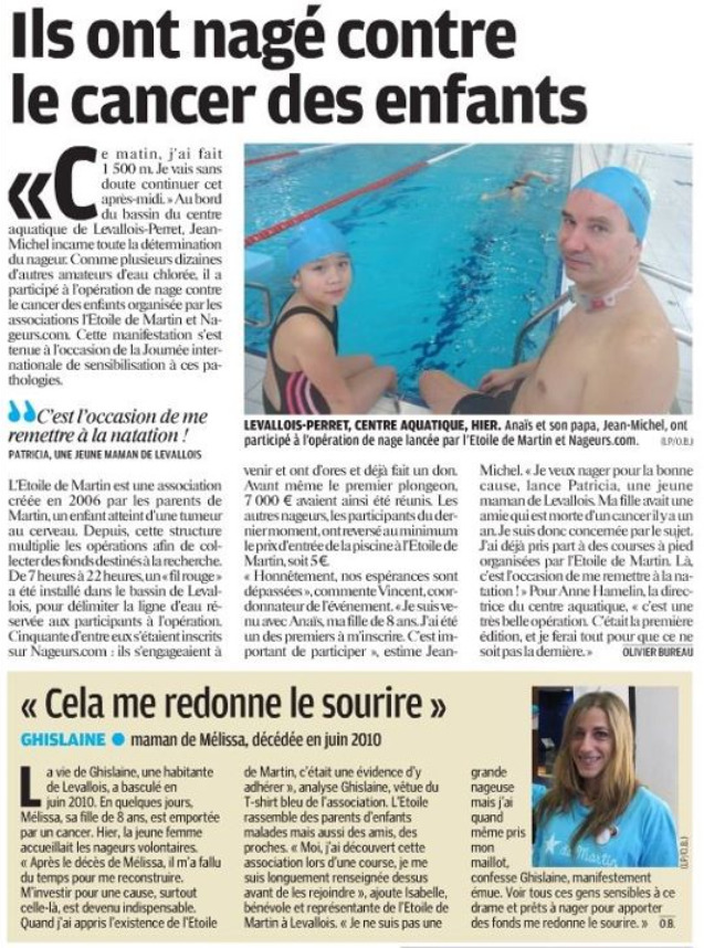 En fait Jean-Michel a nagé plusieurs fois pour L'étoile de Martin, notamment avec sa fille à la piscine de Levallois, ils étaient en photo dans le Parisien, ou un autre journal? Alors comme l'Etoile de Martin a transféré ses dons à Roussy , ça serait logique de faire un don à Roussy qui de toute façon, fait de la recherche pour tous les cancers pédiatriques
