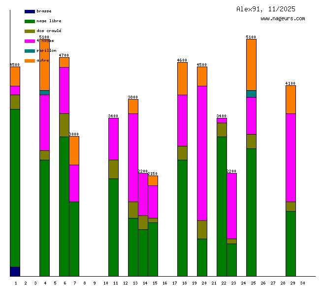 Ces 6 derniers mois, Alex91 a nagé dans les piscines suivantes : Piscine des Lacs (Viry-Châtillon) (151.7 km), Centre Aquatique Pajeaud (Antony) (98.3 km), Stade nautique Youri Gagarine (Villejuif) (16.7 km), Piscine du Jardin Parisien (Clamart) (8.8 km), Piscine Chantereyne (Cherbourg) (5.6 km).