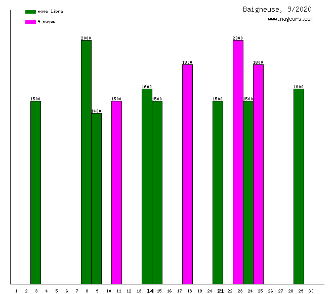 Ces 6 derniers mois, Baigneuse a nagé dans les piscines suivantes : Piscine Port Marchand (Toulon) (12 km), Piscine municipale d'Amélie-les-Bains-Palalda (6 km), Piscine municipale de Argelès-sur-Mer (3 km), Complexe aquatique de Hyères (2 km).