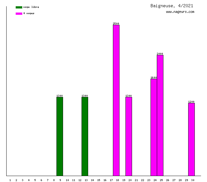 Ces 6 derniers mois, Baigneuse a nagé dans les piscines suivantes : Piscine Port Marchand (Toulon) (12 km), Piscine municipale d'Amélie-les-Bains-Palalda (6 km), Piscine municipale de Argelès-sur-Mer (3 km), Complexe aquatique de Hyères (2 km).