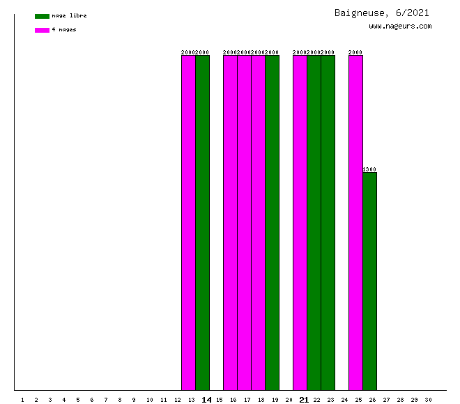 Ces 6 derniers mois, Baigneuse a nagé dans les piscines suivantes : Piscine Port Marchand (Toulon) (12 km), Piscine municipale d'Amélie-les-Bains-Palalda (6 km), Piscine municipale de Argelès-sur-Mer (3 km), Complexe aquatique de Hyères (2 km).