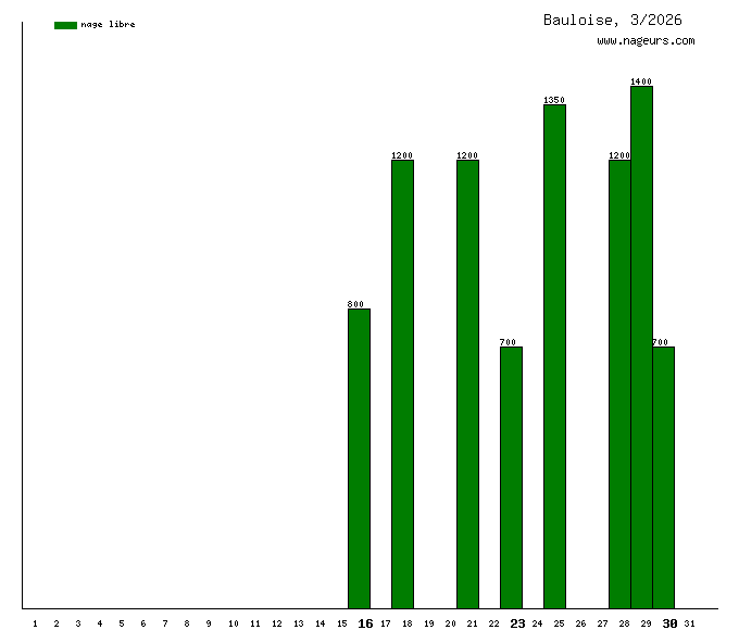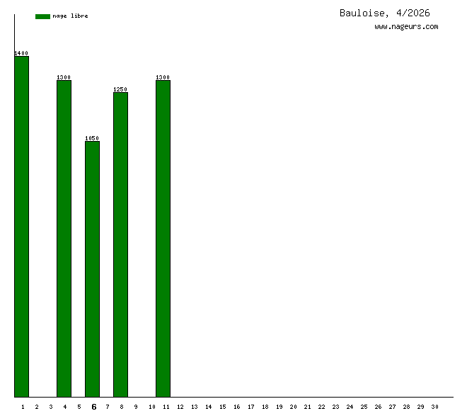 Ces 6 derniers mois, Bauloise a nagé dans les piscines suivantes : Piscine Porte de la Plaine (Paris) (40.5 km), Piscine René et André Mourlon (Paris) (24.3 km).
