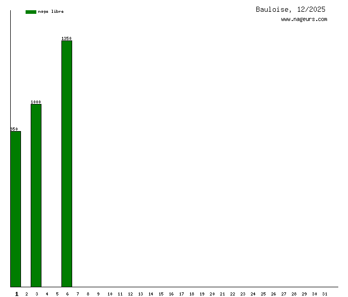 Ces 6 derniers mois, Bauloise a nagé dans les piscines suivantes : Piscine René et André Mourlon (Paris) (24.5 km), Centre aquatique Aquabaule (Avenue Honoré de Balzac La Baule-Escoublac ) (21.5 km), Piscine Porte de la Plaine (Paris) (20.2 km), Centre Aquatique Aqua Baie (Avranches) (2.6 km).