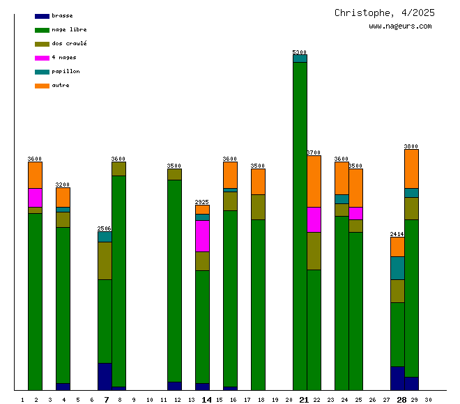 Ces 6 derniers mois, Christophe a nagé dans les piscines suivantes : Piscine Blomet (Paris) (108.4 km), Piscine d'Auteuil (Paris) (43.2 km), Piscine Emile Anthoine (Paris) (29.7 km), Piscine Jacqueline Auriol (Paris) (21.5 km), Centre Aquatique Olympique (Saint-Denis) (14.7 km), Piscine Henry de Montherlant (Paris) (11.2 km).