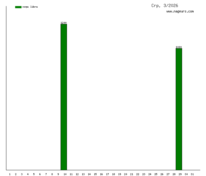 Ces 6 derniers mois, Crp a nagé dans les piscines suivantes : Piscine Alex Jany (Toulouse) (2.8 km), Piscine Bellevue (Toulouse) (2.7 km), Piscine municipale de Castanet-Tolosan (2.4 km), Piscine Yvonne Godard - ex Pech David (Toulouse) (2.2 km), Calicéo Toulouse L'Union (1000m), Piscine Castex (Toulouse) (1000m).