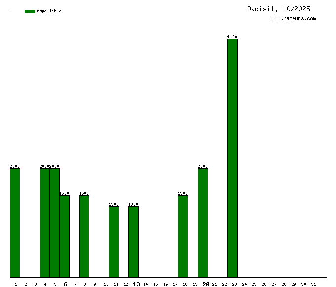 Ces 6 derniers mois, Dadisil a nagé dans les piscines suivantes : Piscine Jean Boiteux, ex Reuilly (Paris) (114.4 km), Piscine Roger Le Gall (Paris) (80.9 km), Piscine Georges Vallerey (Paris) (12.7 km), Centre Aquatique Camille Muffat à Aubervilliers (10.2 km), Centre Aquanautique Camille Muffat (Rosny sous Bois) (8.6 km), Piscine Yvonne Godard (Paris) (7.5 km), Piscine Jean Boiteux (Draguignan) (2.1 km).