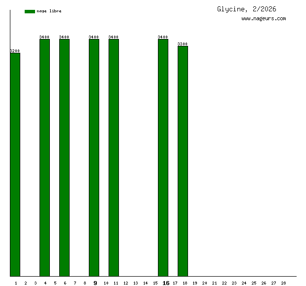 Ces 6 derniers mois, Glycine a nagé dans les piscines suivantes : Piscine Georges Hermant (Paris) (146.1 km), Piscine Rouvet (Paris) (33.8 km), Piscine de Pontoise (Paris) (24 km), Piscine Georges Vallerey (Paris) (7 km), Piscine Pailleron (Paris) (3.6 km), Piscine Suzanne Berlioux (Paris) (3.6 km), Piscine Solita Salgado (Paris) (3.4 km), Piscine Keller (Paris) (3.4 km), Piscine Paul Valeyre (Paris) (3.4 km), Complexe sportif Alice Milliat Millau (3.3 km), Piscine des Amiraux (Paris) (3.2 km).
