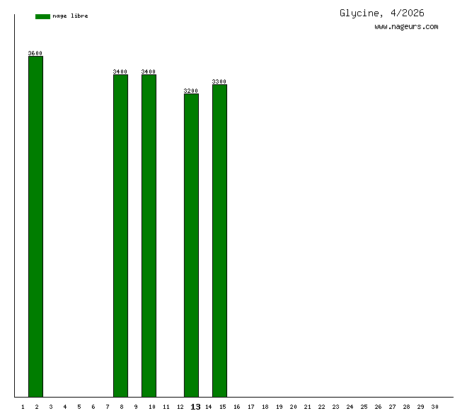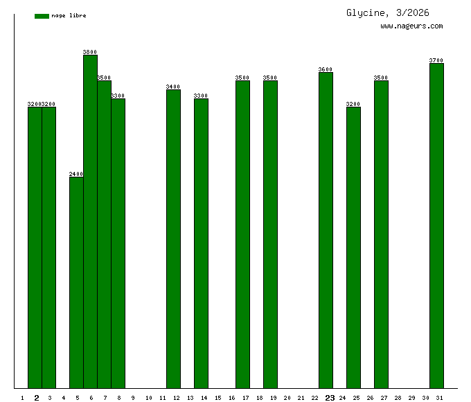 Ces 6 derniers mois, Glycine a nagé dans les piscines suivantes : Piscine Georges Hermant (Paris) (150.1 km), Piscine de Pontoise (Paris) (17.4 km), Piscine Rouvet (Paris) (17.2 km), Piscine Georges Vallerey (Paris) (17.2 km), Piscine Château Landon (Paris) (4.3 km), Stadtbad Mitte (Berlin, Allemagne) (3.8 km), Piscine Pailleron (Paris) (3.6 km), Piscine Suzanne Berlioux (Paris) (3.6 km), Aquarena (Sevran) (3.5 km), Lazdynų baseinas (Vilnius, Lituanie) (3.5 km), Centre aquatique de la plaine (Sartrouville) (3.5 km), SSE Schwimm- und Sprunghalle im Europapark (Berlin, Allemagne) (3.5 km), Piscine Paul Valeyre (Paris) (3.4 km), Schwimmhalle Finckensteinallee (Berlin Steglitz-Zehlendorf, Allemagne) (3.3 km), Centrum Sportowo-Rehabilitacyjne WUM (Warszawa, Pologne) (3.2 km), Ośrodek Inflancka (Warszawa, Pologne) (3.2 km), Piscine des Amiraux (Paris) (3.2 km), Stadtbad Neukölln (Berlin, Allemagne) (2.4 km).