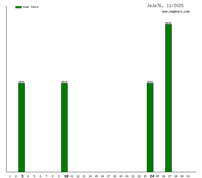 Ces 6 derniers mois, JeJe76 a nagé dans les piscines suivantes : Piscine Eurocéane (Mont-Saint-Aignan) (25 km), Piscine de Grand-Couronne (5 km).