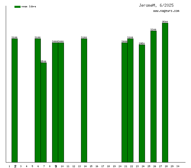 Ces 6 derniers mois, JeromeM a nagé dans les piscines suivantes : Piscine Keller (Paris) (76.4 km), Piscine Blomet (Paris) (21.1 km), Piscine Roger Le Gall (Paris) (12.4 km), Piscine olympique du Grand Dijon (3.1 km), Espace aquatique Fernand Bonnin (Seurre) (3 km), Annette K. (Port Javel Bas, Paris 15ème (M° Javel)) (2 km), PISCINE PRIVEE (650m).
