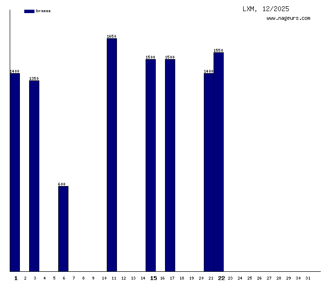 Ces 6 derniers mois, LXM a nagé dans les piscines suivantes : Piscine Porte de la Plaine (Paris) (22.6 km), Centre Aqualudique Orléans l'O (4.7 km), Piscine Didot (Paris) (2.7 km), Piscine municipale de Meung-sur-Loire (2.4 km), Centre Aqua Attitude (Reims) (2.4 km), Piscine René et André Mourlon (Paris) (1.5 km), Piscine Blomet (Paris) (1.5 km), Piscine Emile Anthoine (Paris) (1.4 km), Piscine Thérèse et Jeanne Brulé (ex Elisabeth) (Paris) (1.3 km), Piscine Keller (Paris) (1.3 km).