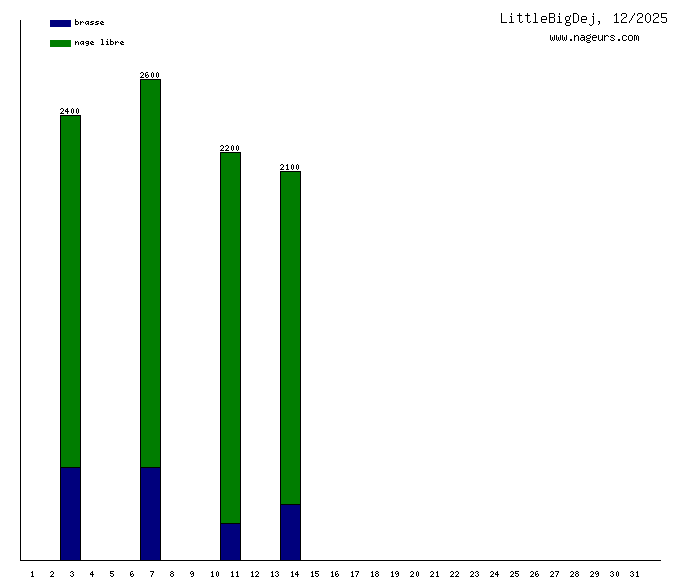 Ces 6 derniers mois, LittleBigDej a nagé dans les piscines suivantes : Piscine René et André Mourlon (Paris) (74.3 km), Piscine municipale de Dinard (2.4 km), Piscine Blomet (Paris) (2.1 km).