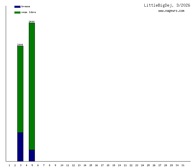 Ces 6 derniers mois, LittleBigDej a nagé dans les piscines suivantes : Piscine René et André Mourlon (Paris) (57.6 km), Piscine Blomet (Paris) (15.8 km), Piscine Jacqueline Auriol (Paris) (2.2 km).