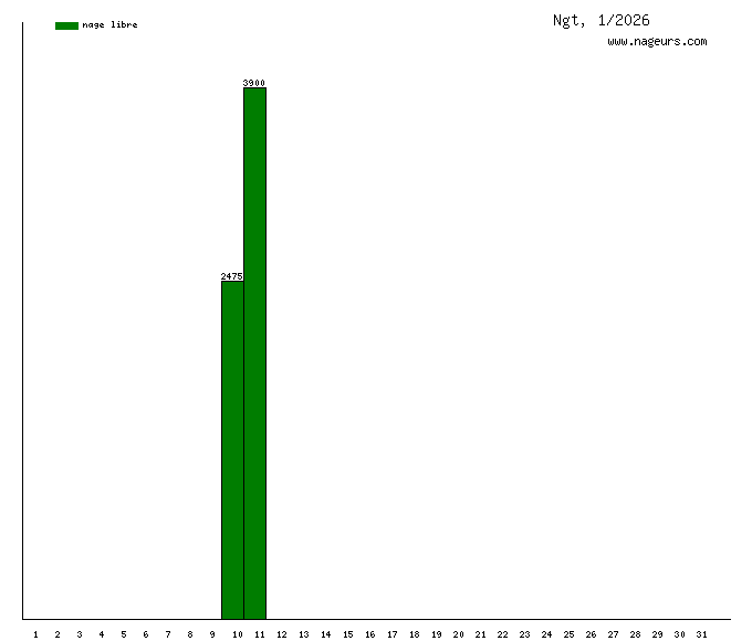 Ces 6 derniers mois, Ngt a nagé dans les piscines suivantes : Piscine Hébert (Paris) (42.6 km), Piscine Blomet (Paris) (5.4 km), Piscine Alfred Nakache (Paris) (3.9 km), Piscine Marjorie-Gestring (ex Champerret) (Paris) (3.5 km).