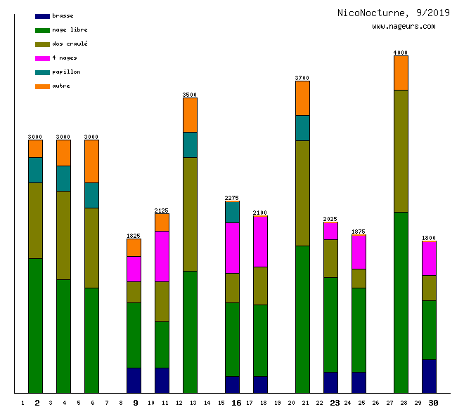 Ces 6 derniers mois, NicoNocturne a nagé dans les piscines suivantes : Piscine Alfred Nakache (Paris) (30.7 km), Piscine Aspirant Dunand (Paris) (28.3 km), Piscine Bellevue (Saint-Quentin-Fallavier) (18.1 km), Piscine Saint Germain (Paris) (12.5 km), Piscine du Ministère de la Défense (Paris) (10.9 km).