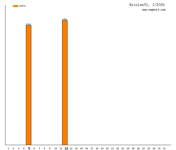 Ces 6 derniers mois, Nicolas91 a nagé dans les piscines suivantes : Piscine Jean Taris (Evry) (29 km), Stade Nautique Gabriel Menut (Corbeil-Essonnes) (12.2 km), Aquastade Val d'Essonne (Mennecy) (1.1 km).