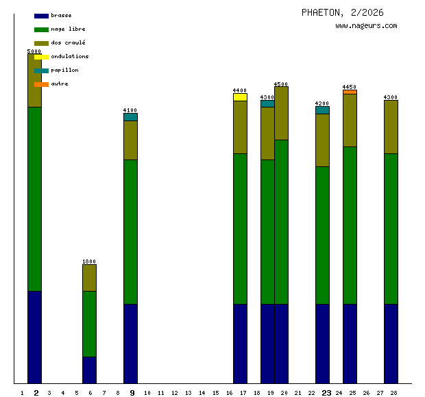 Ces 6 derniers mois, PHAETON a nagé dans les piscines suivantes : Piscine Alban Minville (Toulouse) (88.9 km), Piscine Thérèse et Jeanne Brulé (ex Elisabeth) (Paris) (38.3 km), Centre Aquatique Olympique (Saint-Denis) (31 km), Piscine Jean Boiteux (Toulouse) (21.6 km), Piscine Pailleron (Paris) (10.1 km), Piscine Georges Vallerey (Paris) (9.2 km), Piscine Bellevue (Toulouse) (6.4 km), Piscine Suzanne Berlioux (Paris) (5.2 km).