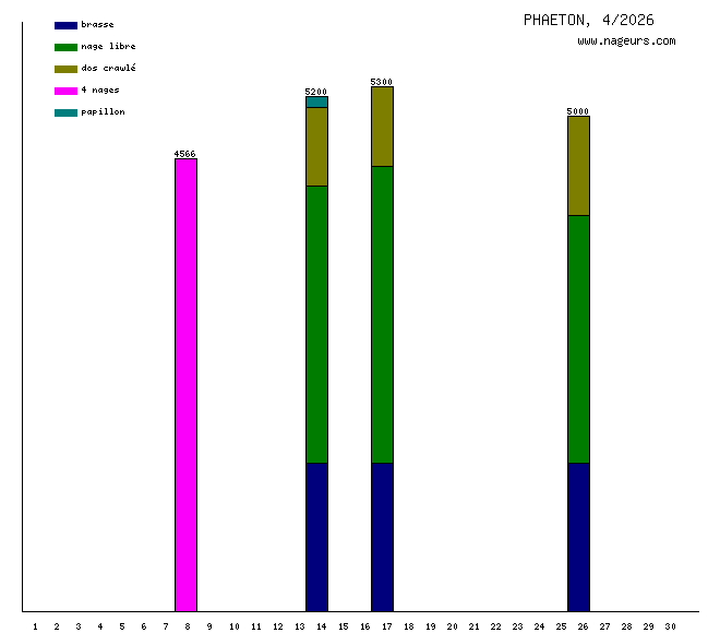 Ces 6 derniers mois, PHAETON a nagé dans les piscines suivantes : Piscine Alban Minville (Toulouse) (101.1 km), Centre Aquatique Olympique (Saint-Denis) (36.2 km), Piscine Thérèse et Jeanne Brulé (ex Elisabeth) (Paris) (33.6 km), Piscine Jean Boiteux (Toulouse) (29.8 km), Piscine Georges Vallerey (Paris) (9.4 km), Piscine Bellevue (Toulouse) (6.4 km), Piscine Suzanne Berlioux (Paris) (5.2 km), Piscine Pailleron (Paris) (5 km), Piscine Armand Massard (Paris) (4.5 km).
