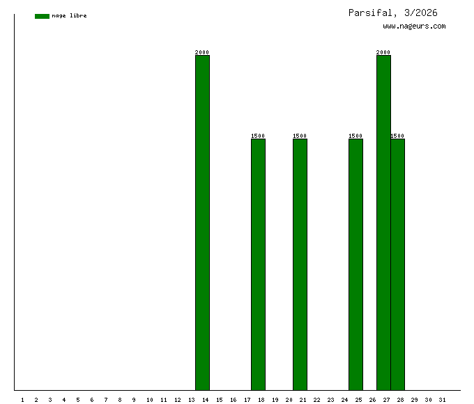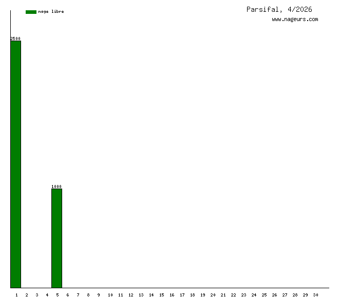 Ces 6 derniers mois, Parsifal a nagé dans les piscines suivantes : Piscine Roger Le Gall (Paris) (73.8 km), Piscine Georges Vallerey (Paris) (5.3 km).