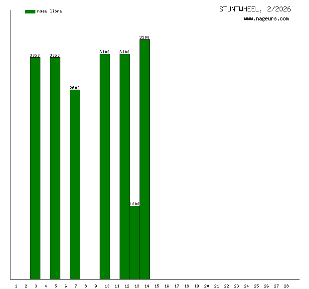 Ces 6 derniers mois, STUNTWHEEL a nagé dans les piscines suivantes : Piscine Suzanne Berlioux (Paris) (131.1 km), Piscine l'Hippocampe (Villiers sur Marne) (45.7 km), Centre Aquatique Intercommunal Paris - Vallée de la Marne (Champs-sur-Marne) (30.7 km).