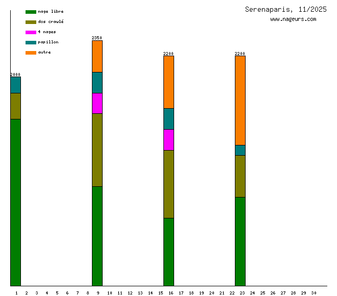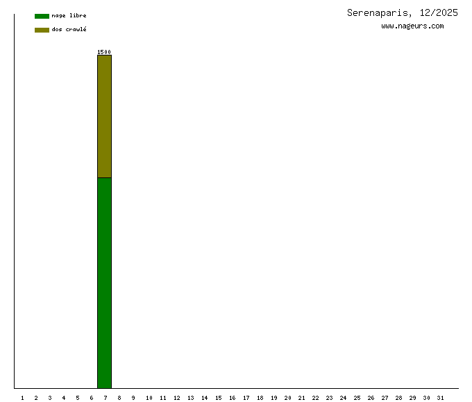 Ces 6 derniers mois, Serenaparis a nagé dans les piscines suivantes : Piscine Cour des Lions (Paris) (23.9 km), Piscine Saint Charles (Marseille) (2 km), Piscine de Pontoise (Paris) (1.6 km).