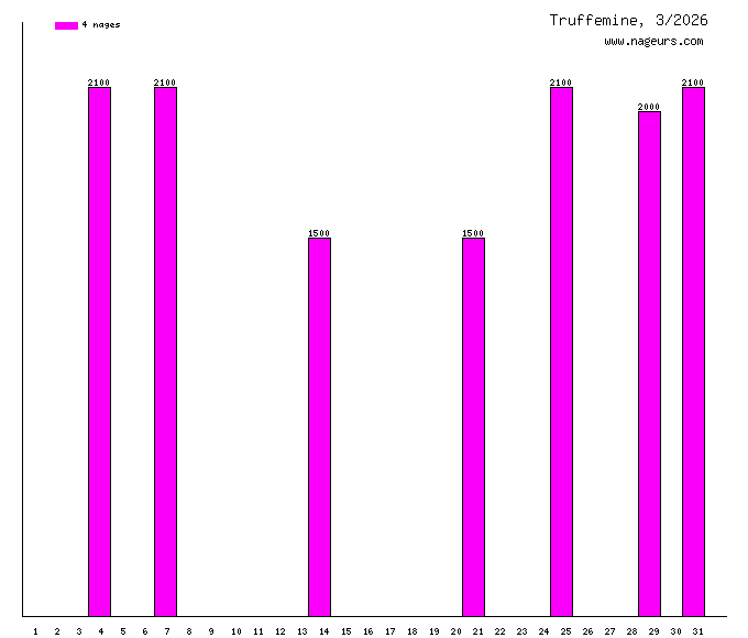 Ces 6 derniers mois, Truffemine a nagé dans les piscines suivantes : Piscine Butte aux Cailles (Paris) (32.6 km), Piscine Jean Boiteux, ex Reuilly (Paris) (12.5 km), Victor E Benstead Plunge (Torrance, CA, Etats Unis) (4.6 km), Jalan Besar Swimming Complex (Singapore, Singapour) (4.4 km), Piscine Roger Le Gall (Paris) (3.7 km), Espace Aquatique Vanocéa (Vannes) (3.7 km), Piscine Suzanne Berlioux (Paris) (3.6 km), Pathumwan Princess (Bangkok, Thailande) (3.2 km), Piscine de Pontoise (Paris) (2.2 km), Piscine Saint Nicolas (Laval) (2.1 km), Piscine de Kercado (Vannes) (2.1 km), Piscine Alain Calmat (Romorantin-Lanthenay) (2.1 km), Bishan Swimming Complex (Singapore, Singapour) (2.1 km), Piscine Jacqueline Auriol (Paris) (2.1 km), Piscine Georges Rigal (Paris) (2.1 km), Piscine Blomet (Paris) (2 km), Piscine de Bréquigny (Rennes) (2 km), Lux Hotel Île de la Réunion (Saint Gilles les bains, Réunion) (1.1 km).